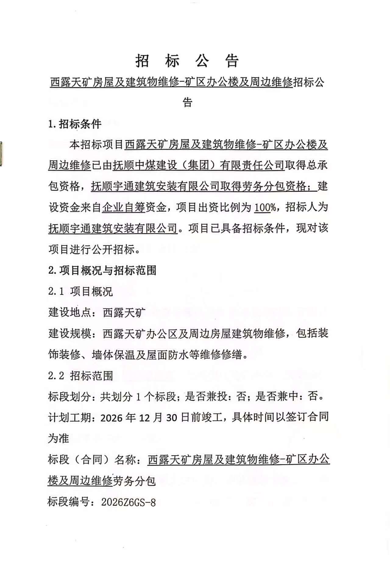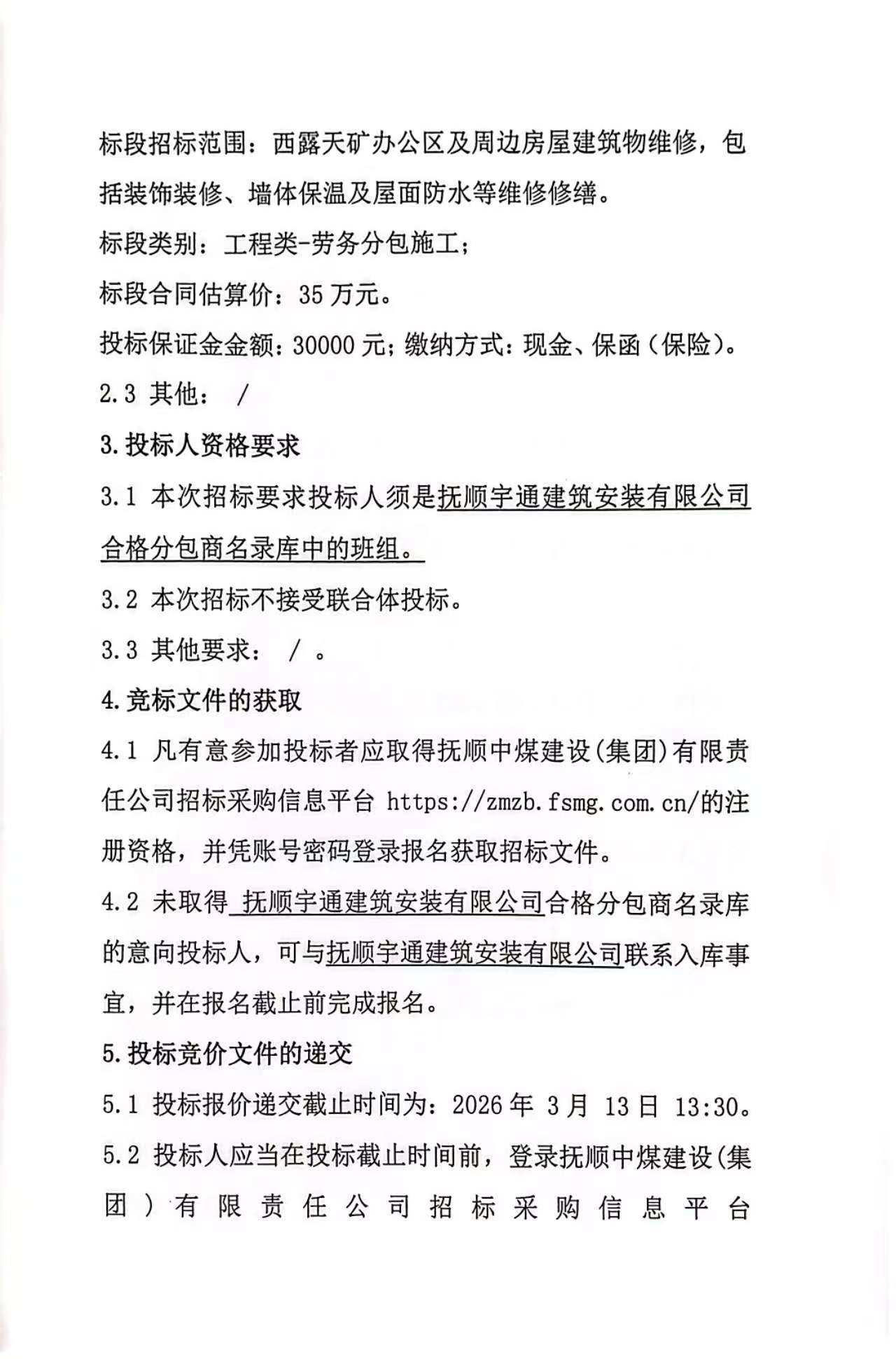公告时间:2026-3-9 14:53:47来源:抚顺中煤建设(集团)有限责任公司招标采购信息平台