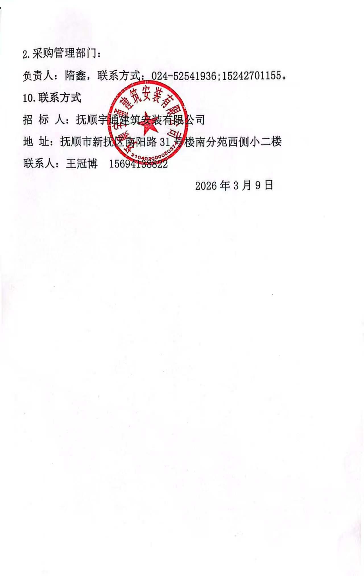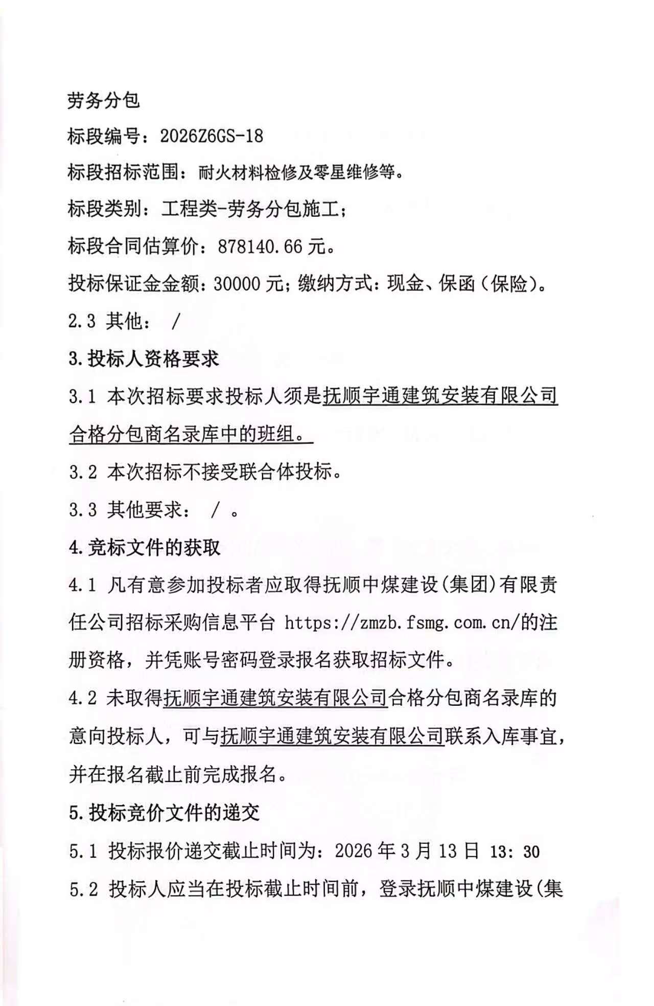 公告时间:2026-3-9 15:09:15来源:抚顺中煤建设(集团)有限责任公司招标采购信息平台